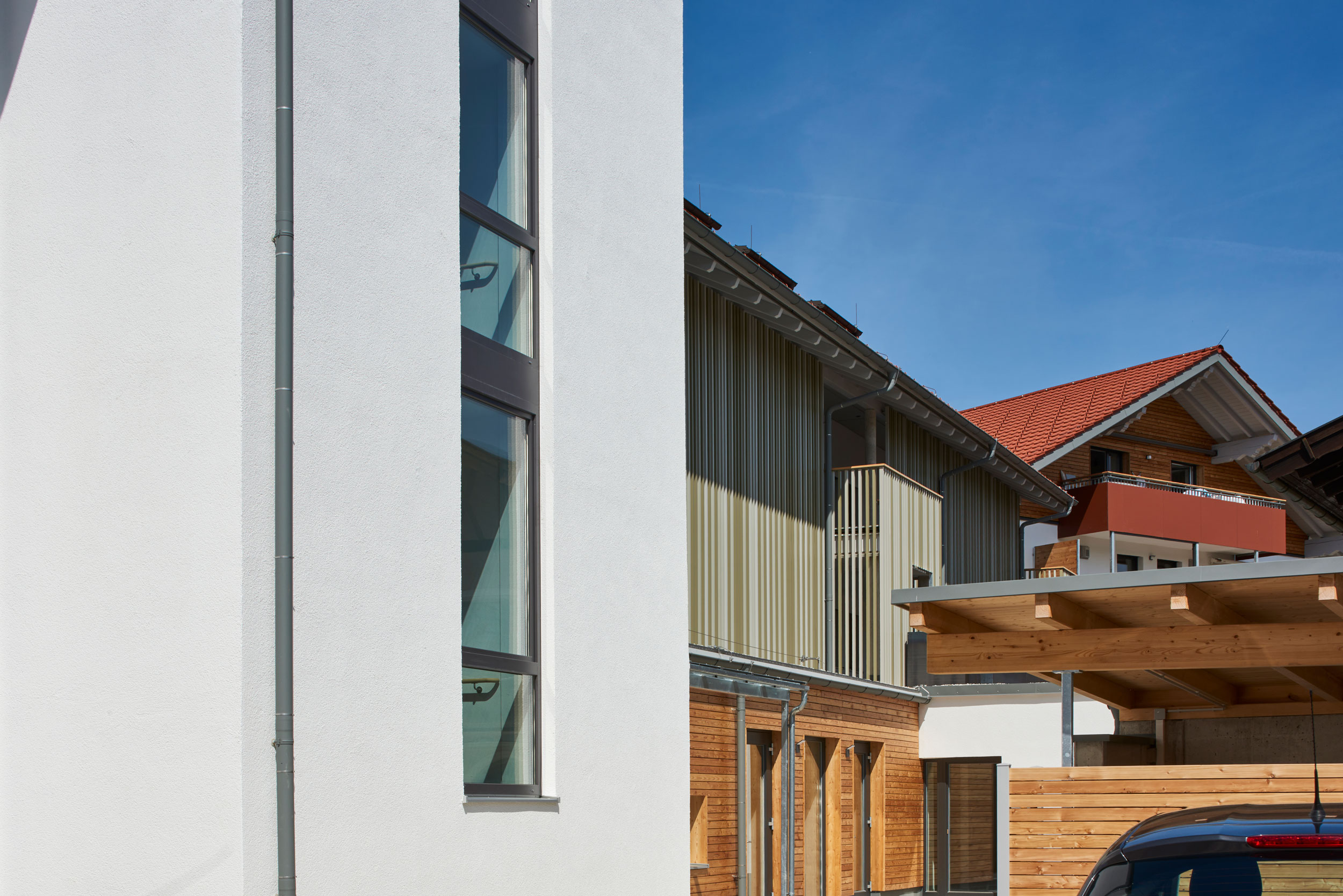 Ein Carport mit Dachbegrünung fungiert als Lärmschutzwand.