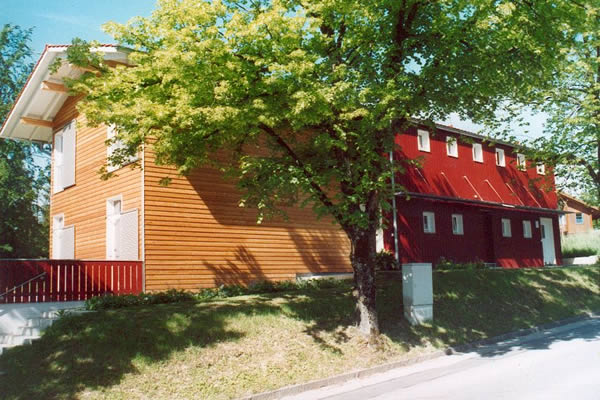 Die nördliche rote Anbauzone ist mit einer senkrechten Bretterschalung verkleidet, sie setzt sich durch ihren farblichen Akzent deutlich vom Hauptbaukörper ab.